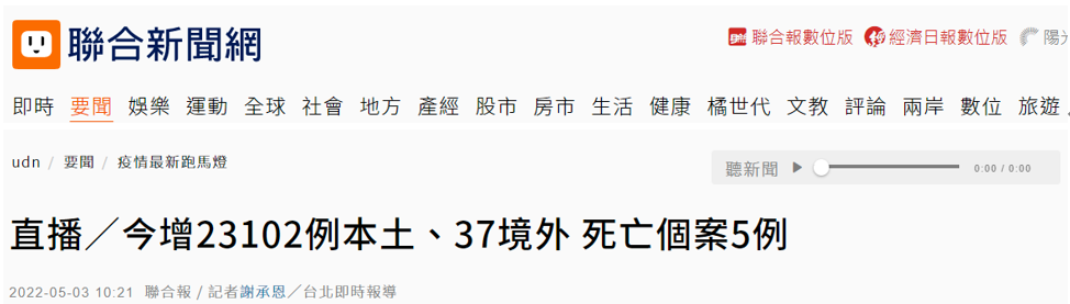 台媒:台灣今天新增23139例新冠確診病例,新增5例死亡病例
