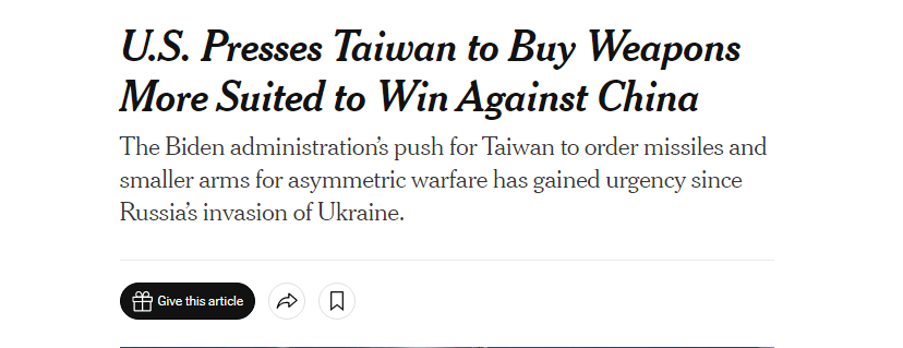《紐約時報》7日援引9個匿名的現任及前任美台官員的話説,比起常規戰爭武器,拜登政府正悄悄施壓台灣,向美國訂購“能幫助台灣小規模軍隊擊退解放軍海上入侵的美國製武器”。俄烏衝突爆發後,華盛頓和台北相信北京在未來幾年“入侵台灣”已成為潛在危險,而小規模軍隊如果採用機動性高及精準打擊的“不對稱戰術”,並且使用正確武器,也能夠擊退大規模軍隊。