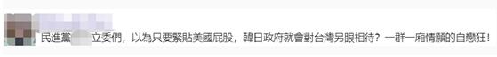 對於韓國未邀請台灣參加總統就職典禮,台外事部門稱仍在持續溝通爭取,有島內網友諷刺道:民進黨當局“立委”們,以為只要緊貼美國屁股,韓國、日本就會對台灣另眼相待?一羣一廂情願的自戀狂!↓