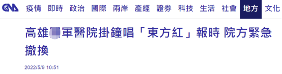此事也被島內綠媒《自由時報》關注到,《自由時報》在標題中這樣説道:超尷尬!“國軍高雄總醫院”掛鐘報時竟播紅色歌曲《東方紅》。
