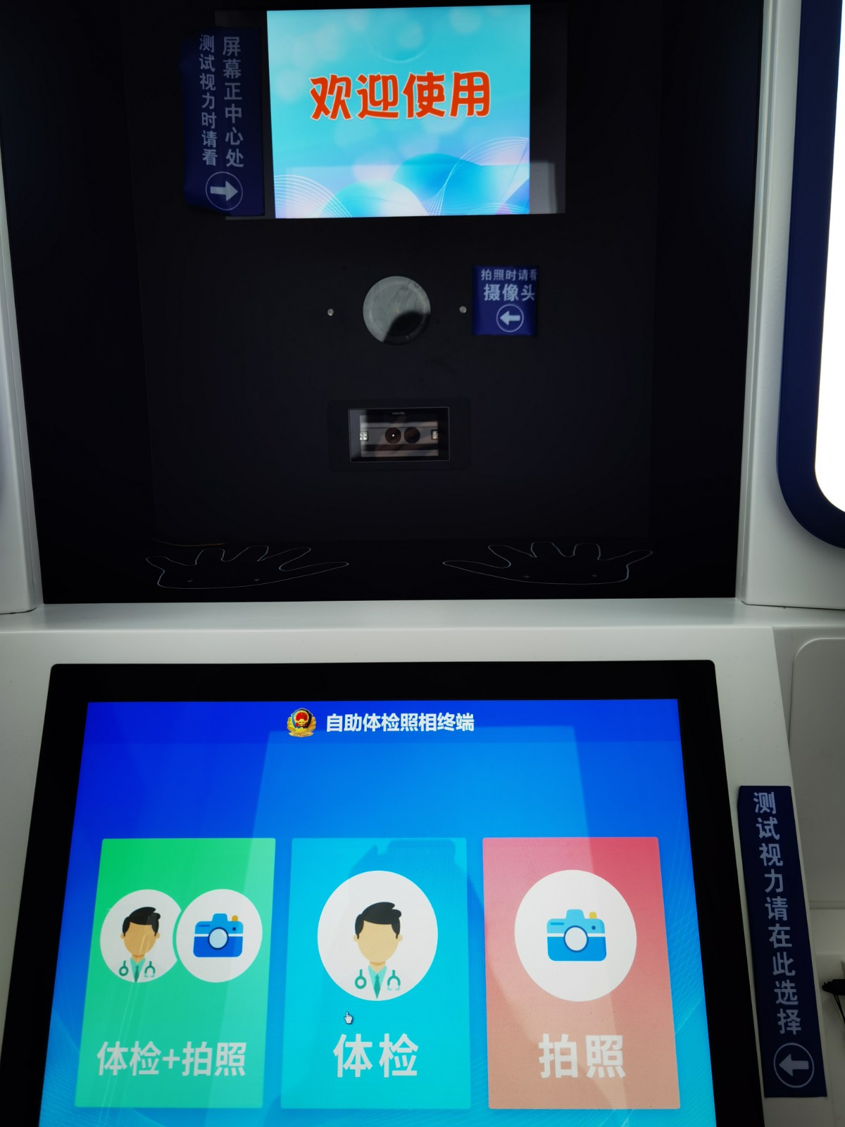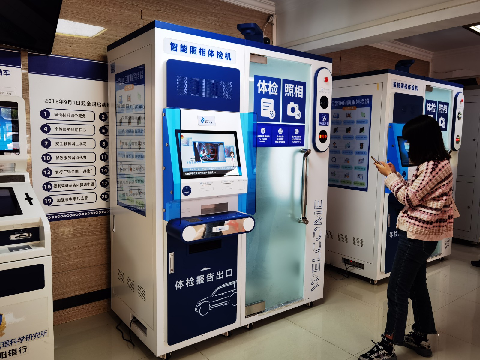 “智能照相體檢機”是集自助體檢、自助拍照功能於一體,融合人臉識別、多模態感知、人工智能算法、行為識別等技術,對人體行為及肢體進行智能化檢測的自助設備,駕駛員的體檢數據經該系統會自動傳輸到交管部門的業務系統。