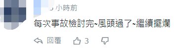 另有網友諷刺民進黨當局,“每次事故檢討完,風頭過了,繼續擺爛”。↓