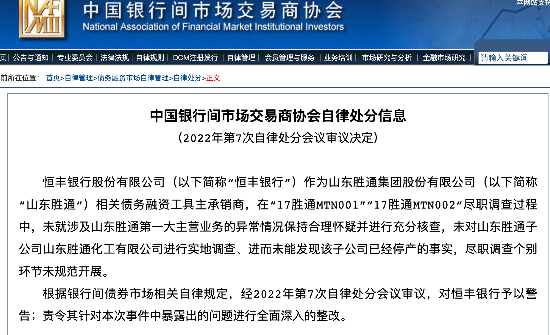 根據中國銀行間市場交易商協會自律處分信息(2022年第7次自律處分會議審議決定),恆豐銀行股份有限公司(以下簡稱“恆豐銀行”)作為山東勝通集團股份有限公司(以下簡稱“山東勝通”)相關債務融資工具主承銷商,在“17勝通MTN001”“17勝通MTN002”盡職調查過程中,未就涉及山東勝通第一大主營業務的異常情況保持合理懷疑並進行充分核查,未對山東勝通子公司山東勝通化工有限公司進行實地調查、進而未能發現該子公司已經停產的事實,盡職調查個別環節未規範開展。