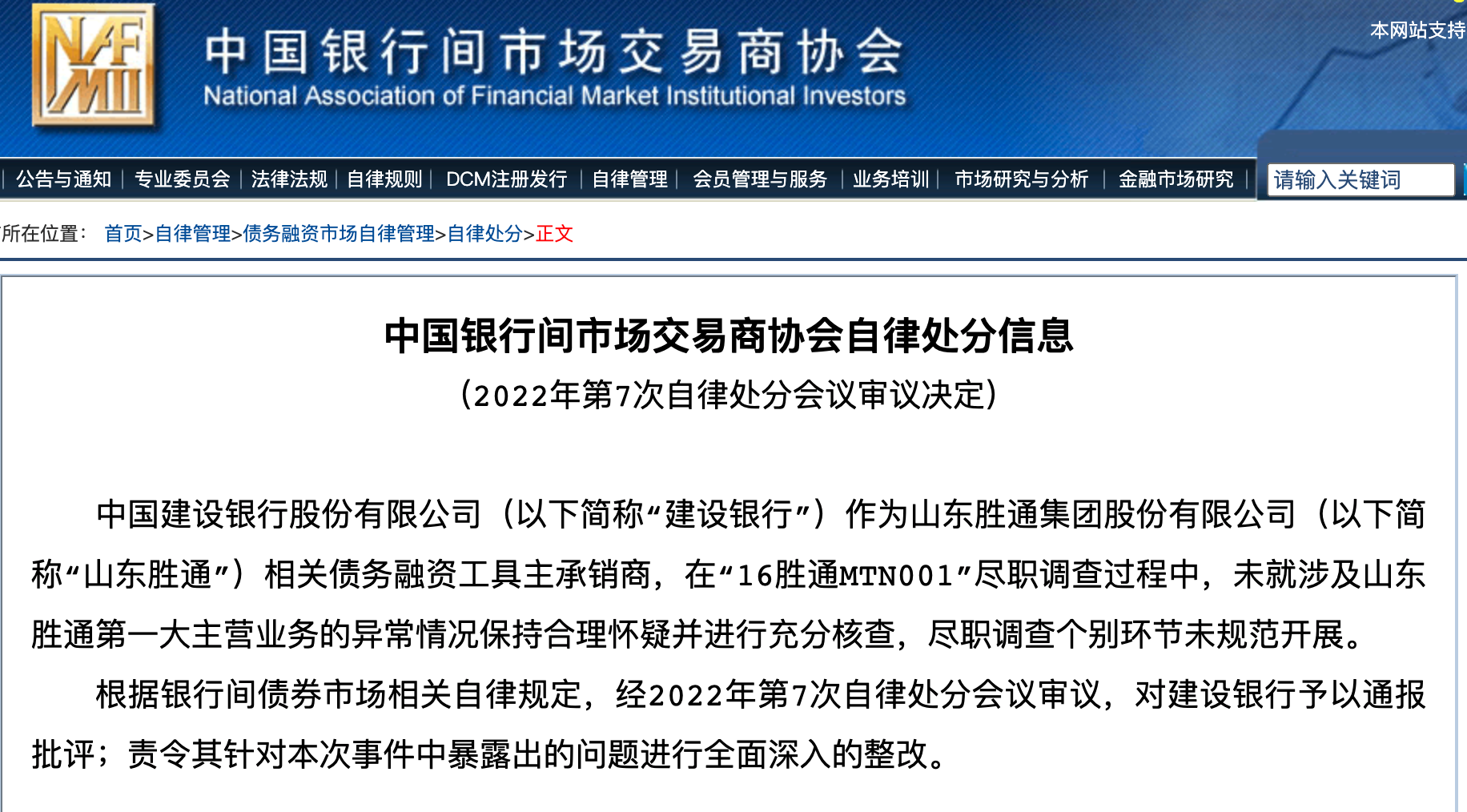 此外,中國建設銀行股份有限公司(以下簡稱“建設銀行”)作為山東勝通相關債務融資工具主承銷商,在“16勝通MTN001”盡職調查過程中,未就涉及山東勝通第一大主營業務的異常情況保持合理懷疑並進行充分核查,盡職調查個別環節未規範開展。