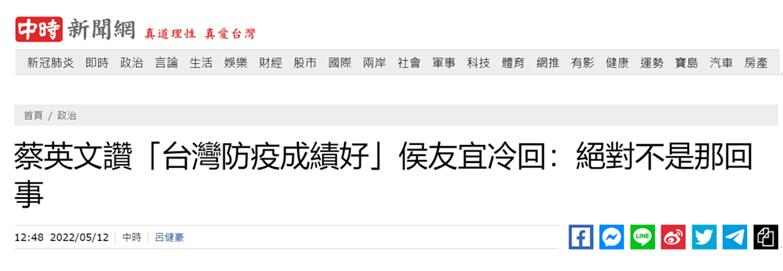 報道稱,蔡英文日前在臉書上發文聲稱,“台灣防疫團隊成績相當好”,這番言論隨即引起許多島內民眾的反彈。對此,侯友宜也諷刺,“我每天都在第一線傾聽民眾的聲音,瞭解民眾的痛苦,絕對不是蔡英文説的那一回事”。