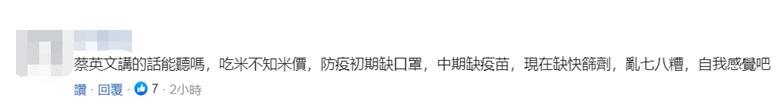 還有網友説,“蔡英文講的話能聽嗎,吃米不知米價,防疫初期缺口罩,中期缺疫苗,現在缺快篩劑,亂七八糟,自我感覺吧”。↓