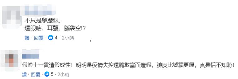 對於蔡英文“台灣防疫成績好”的這番言論,不少島內網友也表示不滿,有網友痛批,“(蔡英文)不只是學歷假,還眼瞎、耳聾、腦袋空!”“假博士(指蔡英文)一貫造假成性!明明是疫情失控還膽敢當面造假,臉皮比城牆更厚,真是恬不知恥!”↓