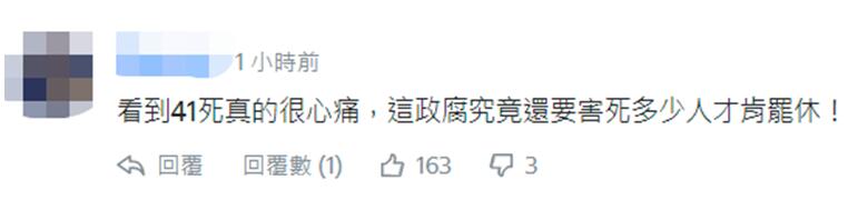 也有網友痛批,“看到41(人)死真的很心痛,民進黨當局究竟要害死多少人才肯罷休!”↓