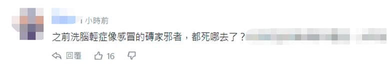 還有網友稱,“之前洗腦(島內民眾)輕症像感冒的(台灣)‘專家’,都去哪了?”↓
