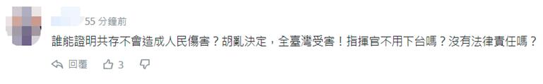 另有網友質疑,“誰能證明共存不會造成民眾傷害(受害)?(民進黨當局)胡亂決定,全台灣受害!指揮官(陳時中)不用下台嗎?沒有法律責任嗎?”↓