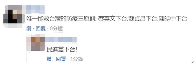 有網友直言,“唯一能救台灣的防疫三原則:蔡英文下台、蘇貞昌下台、陳時中下台”,另有網友補充道,“民進黨下台!”↓
