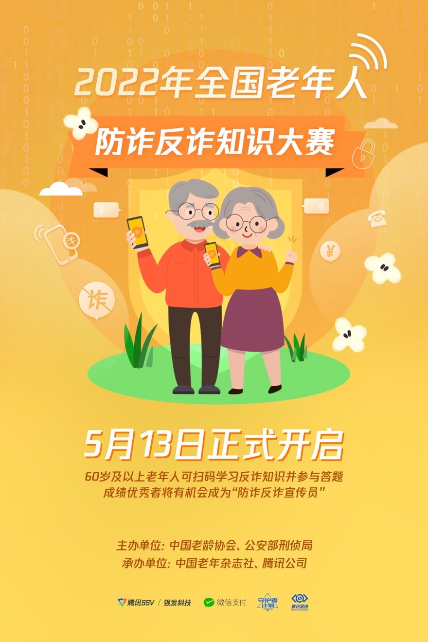 為提升老年羣體防騙識騙能力,守護老年人的“錢袋子”, 5月13日,由中國老齡協會、公安部刑偵局主辦,中國老年雜誌社、騰訊公司承辦的“2022年全國老年人防詐反詐知識大賽”正式啓動。作為“全民反詐在行動”集中宣傳月的一項重要活動,大賽通過線上線下反詐知識科普、反詐知識競答等多種方式為老年人普及反詐知識。