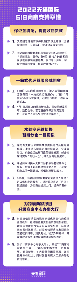 為緩解跨境商家經營壓力、加速資金週轉,天貓國際的跨境商家店鋪支持保證金共享,為商家減免50%保證金。同時,為商家提供累計40億元額度的提前收款服務,可提前收款約22天。