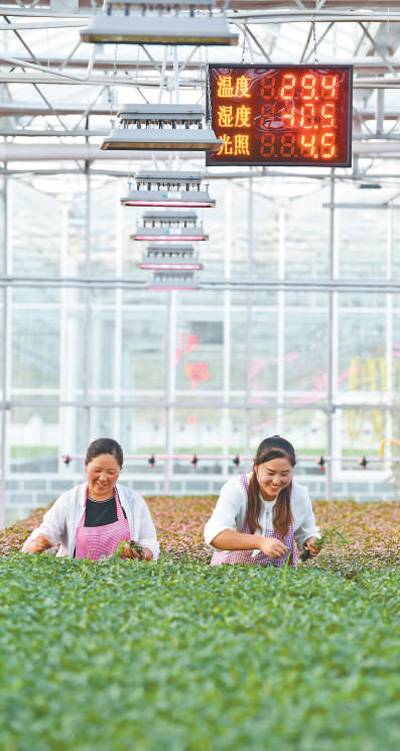 農民在貴州省威寧縣的江楠育苗中心管理蔬菜苗,大棚內的温度、濕度、光照可通過人工智能系統調控。