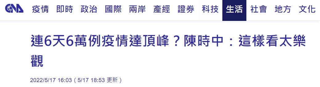 【環球網綜合報道 記者趙友平】“中央社”、“ETtoday新聞雲”等台媒消息稱,台灣新冠肺炎單日確診病例已連續6天維持在6萬多例,外界關注是否意味台灣疫情已達頂峯。對此,台灣地區流行疫情指揮中心指揮官陳時中17日認為,這樣看太樂觀,時機還沒到。