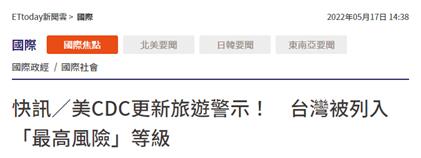 台媒:美CDC更新旅遊警示名單,台灣被列入“最高風險”等級