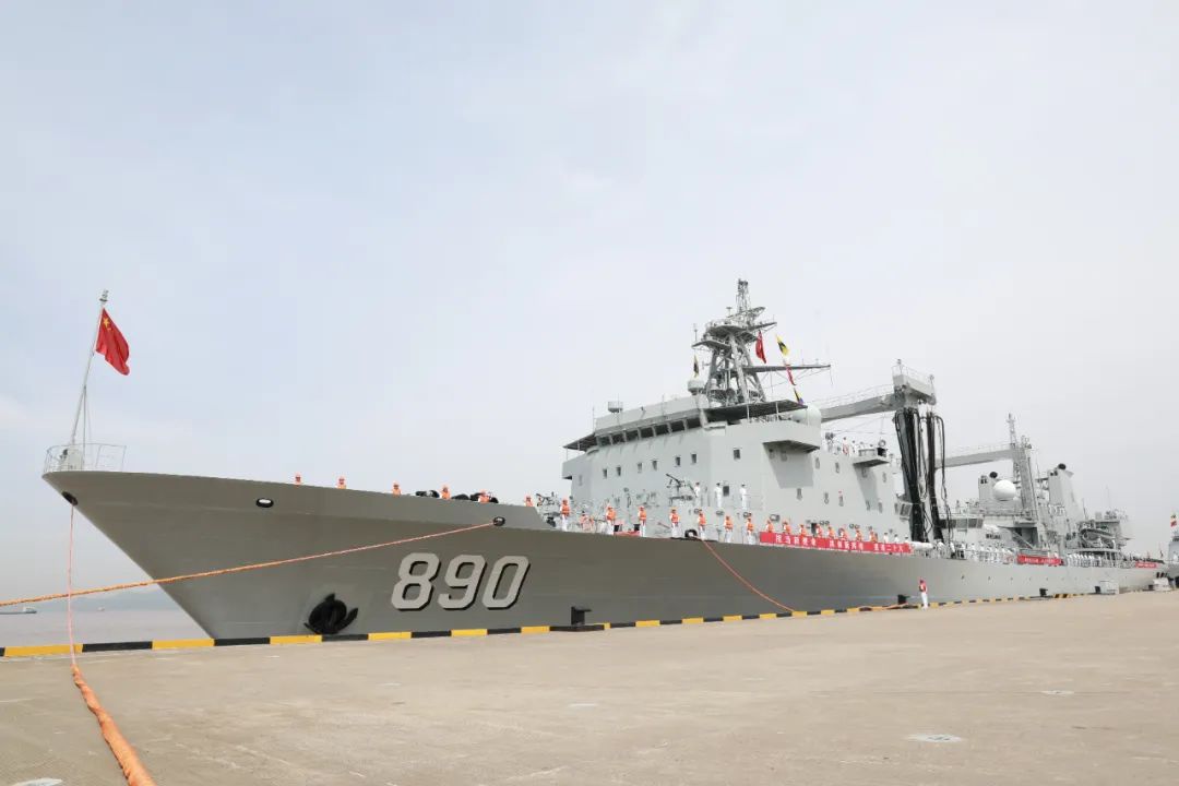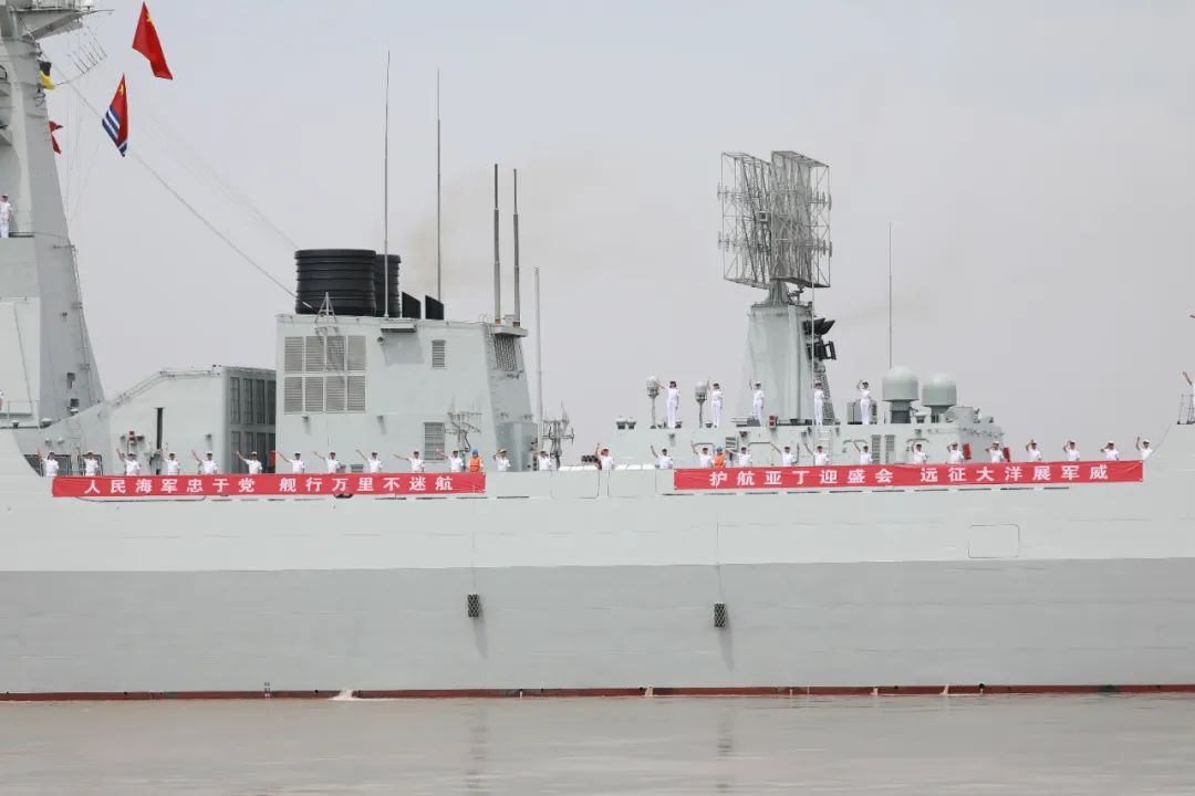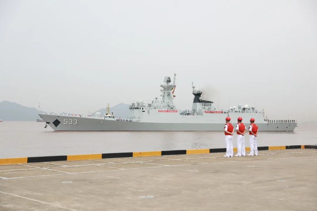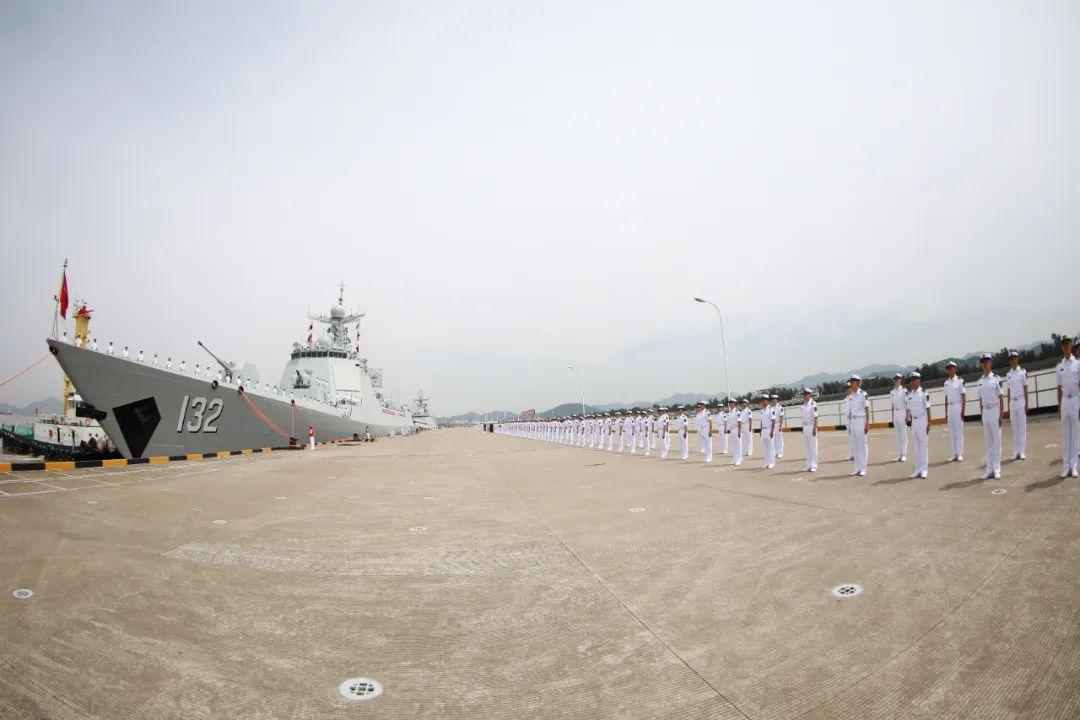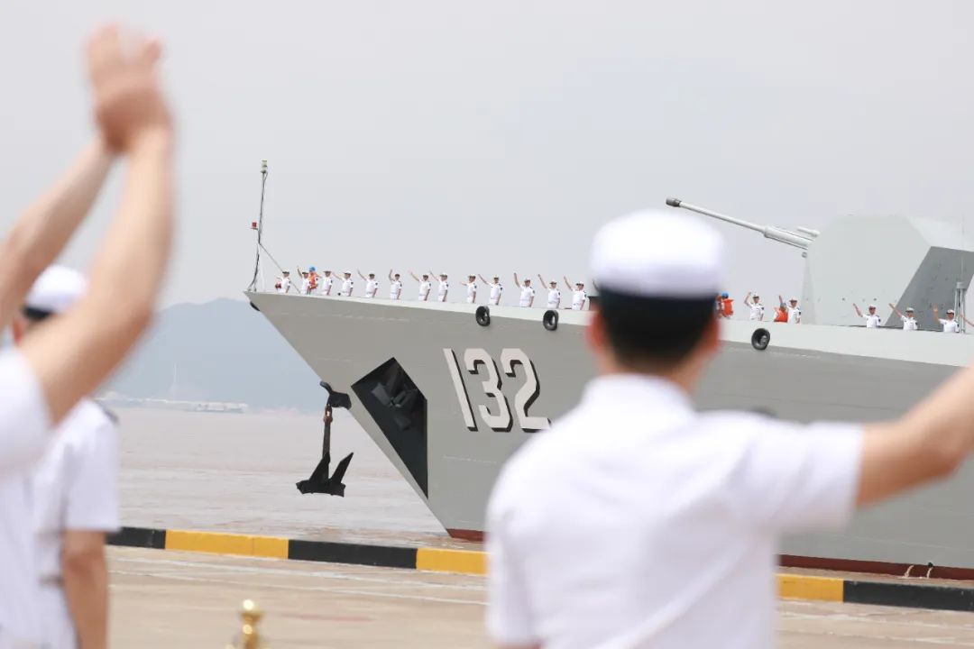東部戰區海軍機關和部隊官兵代表200餘人到碼頭送行。編隊艦艇命名城市有關領導、市民羣眾及護航官兵親屬以慰問信、慰問視頻等形式發來祝福。