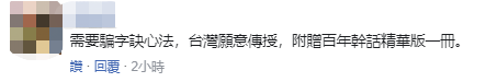 更有人諷刺稱,“需要騙字訣心法,台灣願意傳授,附贈百年幹話精華版一冊。”↓