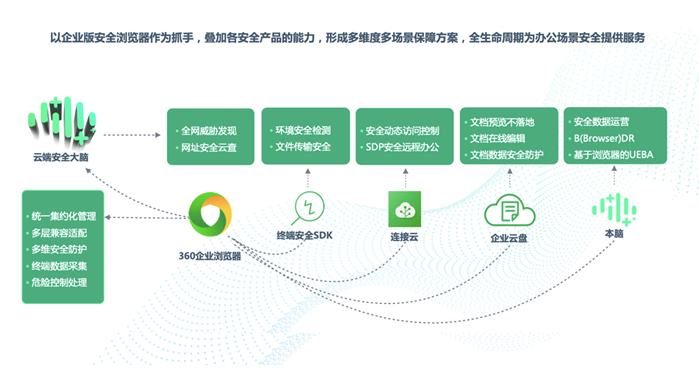 基於多年實戰經驗積累,360政企安全集團以體系化作戰/對抗/攻防思維的新戰法為指導,打造了一套以雲端安全大腦為核心的數字安全能力體系。此次360企業安全瀏覽器與數字安全能力體系充分融合後,將基於360雲端安全大腦提供的總存儲數量超2EB的安全大數據、總量超過300億的全球獨有攻防知識庫、高質量威脅情報等強大能力,以及360核心安全大腦“運營商級”的大數據處理及分析技術,結合雲端安全專家的持續運營,在瀏覽器安全預警與防護方面實現雲地一體化的體系化作戰。同時,360企業安全瀏覽器內置的動態防護能力與360 EDR、終端安全沙箱等終端安全技術相結合,進一步提升自身安全能力。