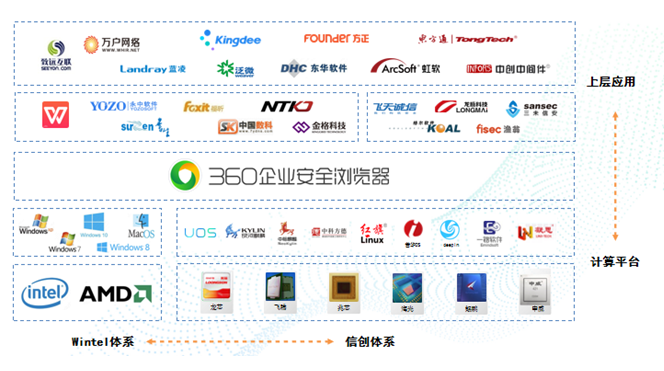 此次360企業安全瀏覽器充分發揮資源優勢,通過與各類信創基礎環境及應用的兼容適配,靈活滿足了政企機構在各類跨平台業務中的無縫操作。其在兼顧原有的以Windows+Intel為代表的Wintel系統體系下,兼容適配了所有信創CPU和操作系統的組合,全面支持龍芯、兆芯、飛騰、鯤鵬、海光等國產CPU,以及麒麟、UOS、深度、凝思磐石、萬里紅、中科方德等國產操作系統。圍繞信創需求所打造的信創應用遷移適配以及國密改造等方案,技術自主可控,為眾多政企用户提供統一跨平台兼容體驗的同時,也大幅降低了信創實施落地成本。