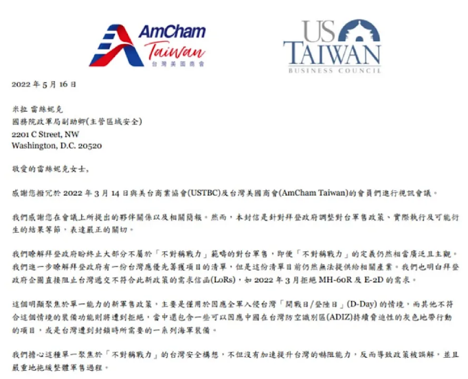 在這封信中,兩大商會稱,台灣要考慮的防禦不只針對大陸,但“新的不對稱政策似乎將台灣防禦降級,僅聚焦於‘開戰日/登陸日’情境所需的能力及系統,使中國可恣意地持續其灰色地帶行動……這種做法反而讓中國在規劃其作戰計劃時更為容易”。而且美國政府對於台灣適用的“不對稱戰力”定義廣泛且主觀,對於個別裝備是否符合“不對稱”的標準也缺乏明確性,對美企產生嚴重不確定性。