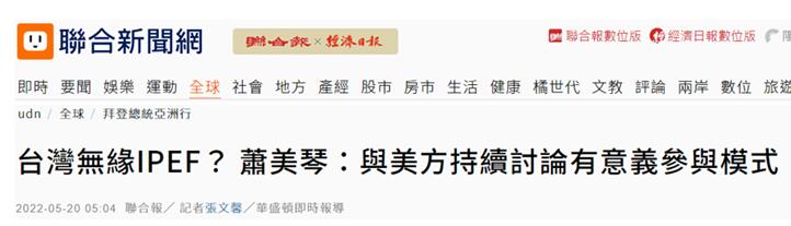 據報道,拜登將在東京與日本首相岸田文雄共同宣佈啓動“印太經濟框架”,美方稱,屆時會有亞洲國家領導人視頻參會。這是拜登政府推動的首個區域經濟架構,台灣已爭取多時,但美方迄今未公開點頭同意;蕭美琴在媒體詢問時回應稱,台灣目前並未受邀參加相關宣佈儀式。