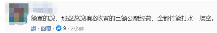 有網友直言,“簡單的説,那些(台當局)遊説賄賂收買(美國政客)的鉅額公關經費,全都竹籃打水一場空”。↓