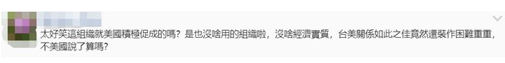 另有網友諷刺,“太好笑這組織就(是)美國積極促成的嗎?是也沒啥用的組織啦,沒啥經濟實質,‘台美關係’如此之佳竟然還裝作困難重重,不美國説了算嗎?”↓