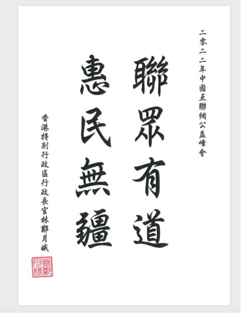 香港特別行政區行政長官林鄭月娥再次為峯會題辭,“聯眾有道,惠民無疆”八個字高度評價了互聯網公益的價值。去年峯會,她就在視頻致辭中稱讚“內地互聯網公益發展之快以及形式之廣,值得香港學習和借鑑”。