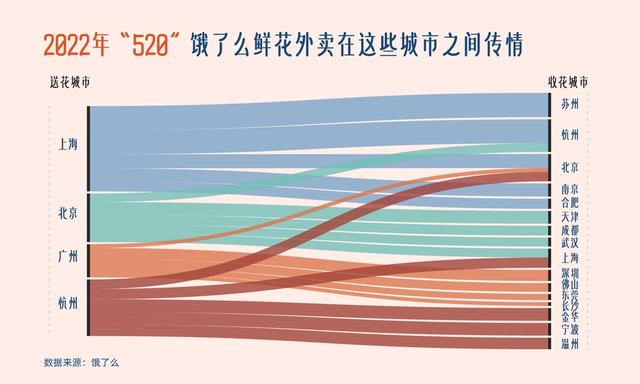 從鮮花外賣傳遞愛的“動線”來看,“520”期間,上海人的愛主要集中傳遞到了蘇州、杭州和北京等城市。杭州人的愛則主要輸送往金華、寧波和温州。北京的外賣鮮花則主要鏈接了天津、武漢和成都等城市。