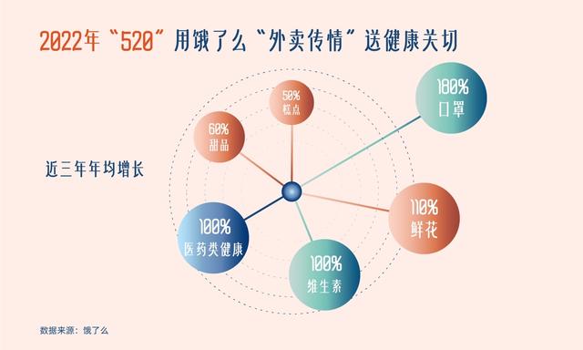 除了鮮花之外,特殊時期,哪怕情人節、“520”這種節日,人們也開始用外賣給愛人贈送口罩、水果、維生素C,更加關心彼此的健康。餓了麼數據顯示,近三年“520”期間,用“外賣傳情”表達健康關切的醫藥健康類商品訂單年均增長1倍,其中,口罩訂單年均增長近2倍,維生素訂單每年翻倍增長。