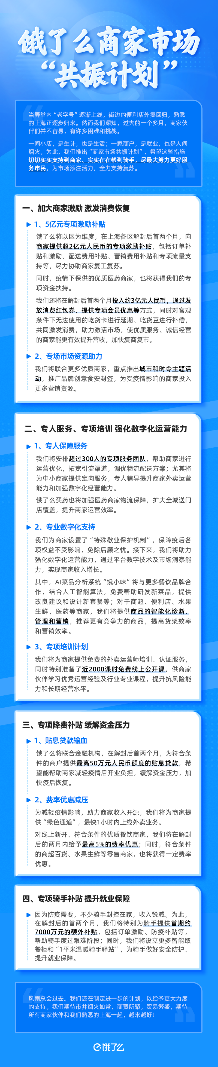 餓了麼方面表示,還在制定進一步的計劃,以給予更大力度的支持,共同加快市場復甦。“我們期待市井煙火如常,所有商傢伙伴和熟悉的上海一起,越來越好。”