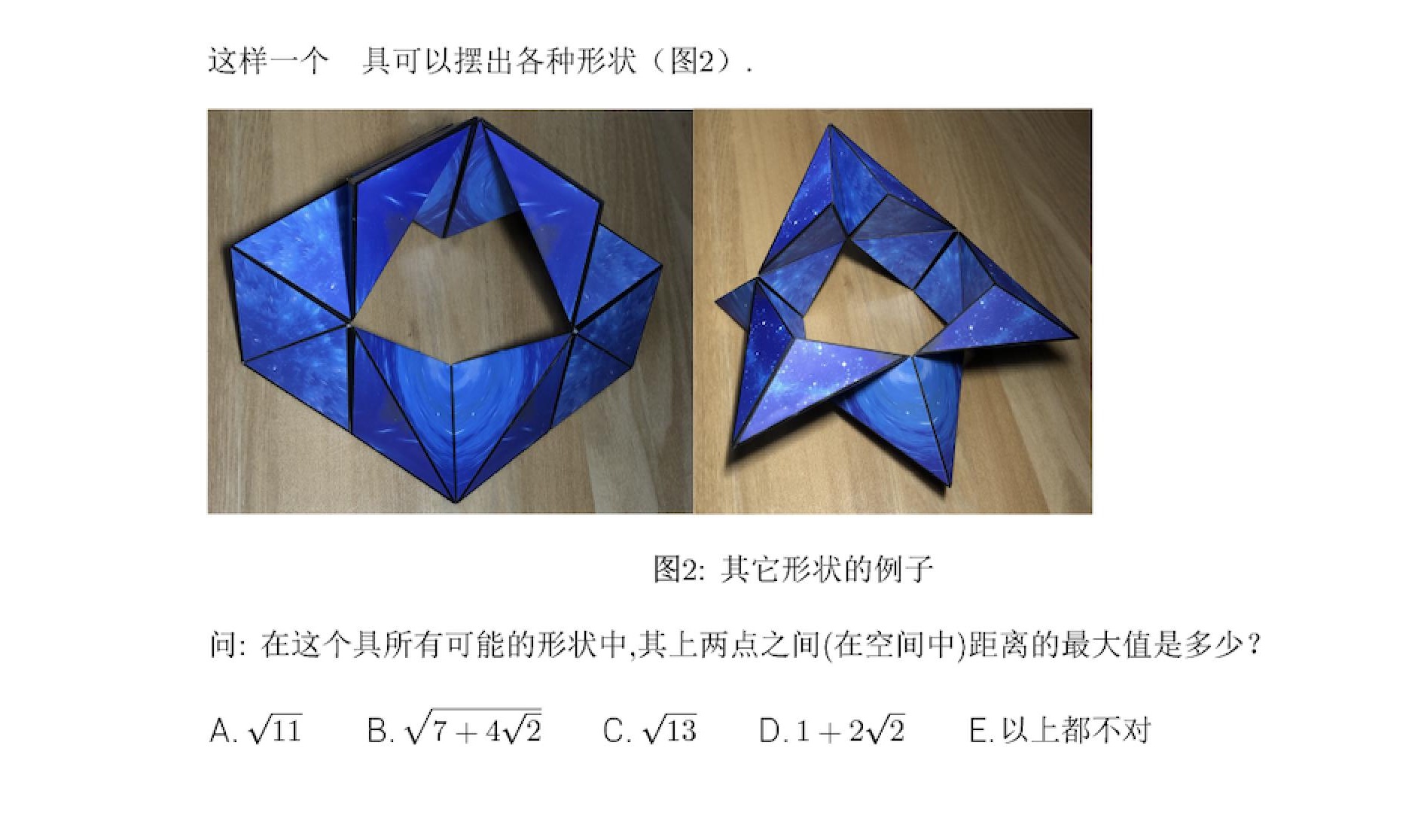 今年的預選賽題共11道,題面取材於冬奧開幕式、快遞送貨、魔方玩具、拆盲盒等日常場景,涉及數列、概率、線性代數、應用數學等方向。其中被諸多選手稱讚“好看”又“有趣”的第一題,求解磁性幾何魔方所有拼接形狀中,兩點距離的最大值,主要考察選手們對空間的想象能力,共有1777名選手給出了正確答案。