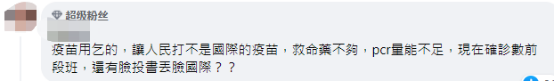 也有網友表示,“疫苗用乞的,讓人民打不是國際的疫苗,救命藥不夠,pcr(核酸檢測)量能不足,現在確診數(處於)前段,還有臉投書丟臉國際??” ↓