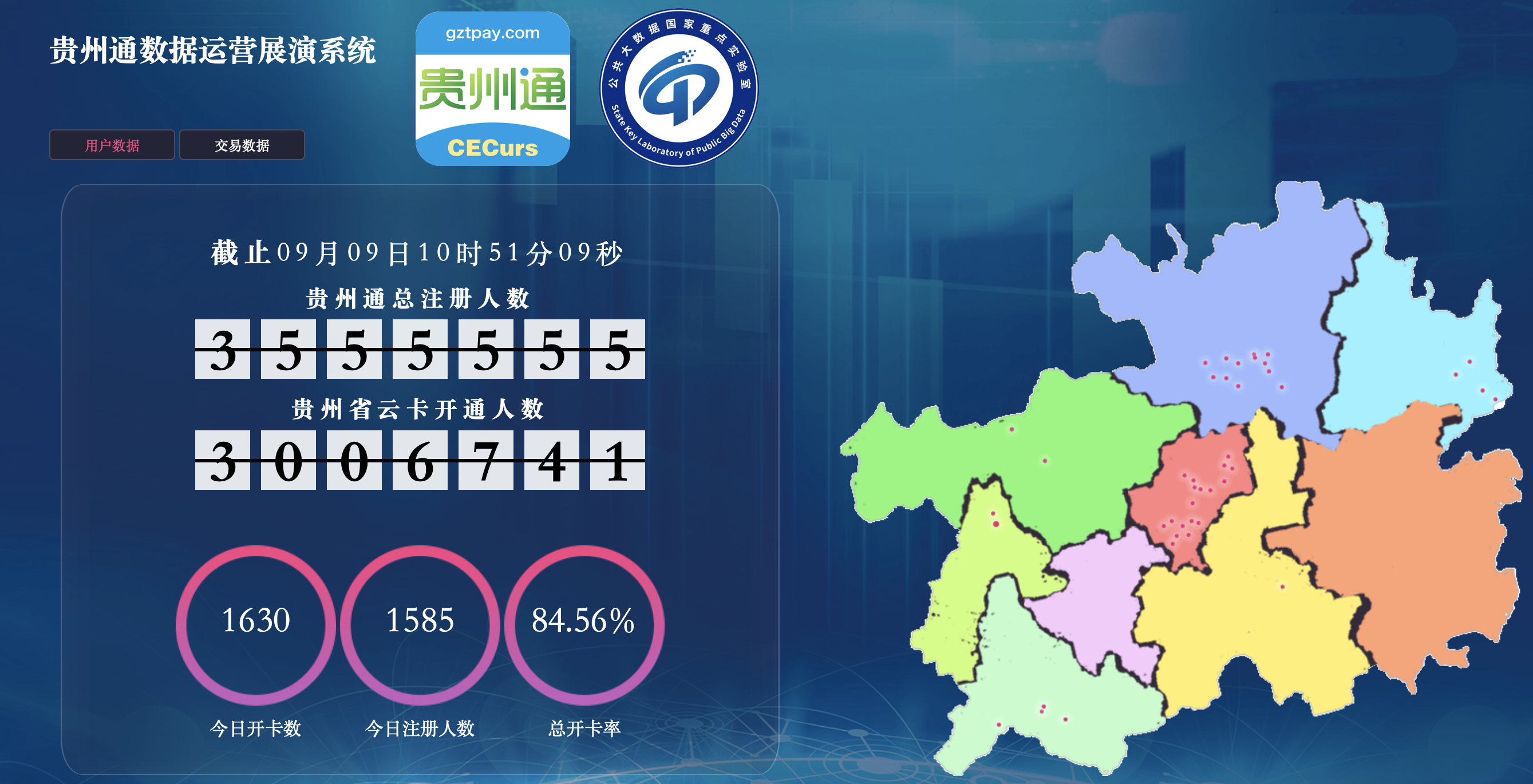“今日開卡數1630、今日註冊人數1585、總開卡率90.59%……”在貴陽移動金融發展有限公司的大屏幕上,都市通(貴州通)數據運營展演系統實施更新着用户數據和交易數據。