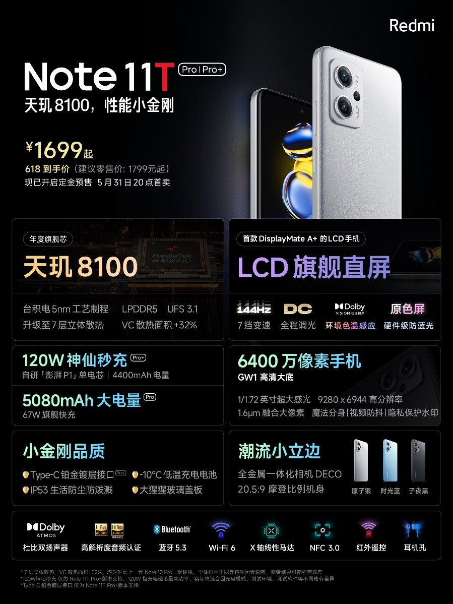 據官方介紹,Redmi Note 11T Pro、Redmi Note 11T Pro+兩款新機均搭載天璣8100處理器,全系標配144Hz LCD屏,其中Note 11T Pro+更是獲得Display Mate A+認證;充電續航方面,自研澎湃P1芯片首次下放Note系列,並配備120W神仙秒充,充滿4400mAh電池僅需19分鐘,Pro版則採用67W快充搭配5080mAh大容量電池,重度場景測試續航1.34天。