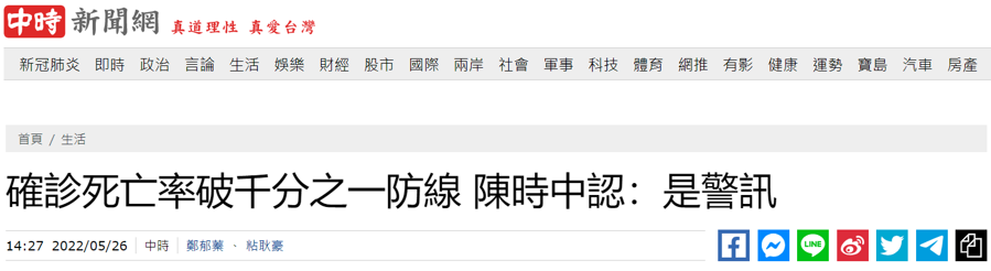 據報道,陳時中此前曾提出,會讓島內疫情的確診死亡率維持在千分之一,但陳時中今天承認,“這兩天來看,死亡率已經超過千分之一,但整體來説沒有超過,維持在萬分之五”。陳時中同時又稱,“整體雖然還未超過,但仍然是個警訊,會持續注意”。