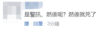 對於目前島內疫情的嚴峻情況和陳時中的上述言論,有島內網友質疑,“是警訊,然後呢?然後就死了”。↓