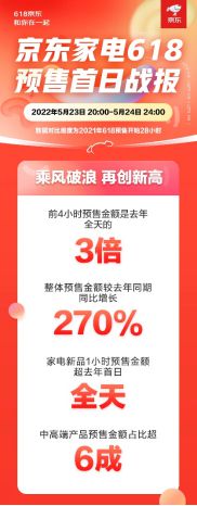 【環球網科技綜合報道】5月23日晚8點,京東家電618預售活動全面開啓,海量巨超值好物點燃消費者購物熱情。截止5月24日24點,電視、冰洗、空調、廚衞、小家電等多個品類紛紛創下預售增長新高,僅前4小時預售金額即達去年全天的3倍,28小時整體預售金額較去年同期同比增長270%。此外,家電新品1小時預售金額超去年首日全天,中高端產品預售金額佔比超6成。
