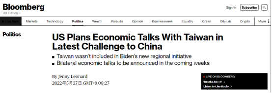 報道稱,上述知情人士爆料的磋商內容與美國總統拜登本週訪問東京期間宣佈啓動的“印太經濟框架”(IPEF)涉及的關鍵領域相近。知情人士稱,雖然美共和黨、民主黨都有議員希望台灣加入“印太經濟框架”,但一些同意加入這一框架的國家因擔心招致中國大陸報復,而拒絕接納台灣,台灣因此無緣加入。