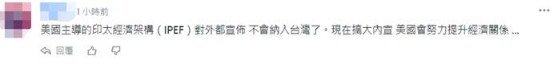 有島內網友稱,“美國主導的‘印太經濟框架’對外都宣佈不會納入台灣了。現在(又)搞‘大內宣’……”↓