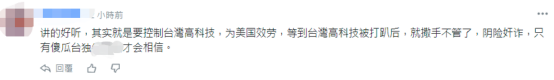 還有人直言,“講得(倒是)好聽,其實就是要控制枱灣高科技(產業),為美國效勞,等到台灣高科技被打趴後,就撒手不管了,陰險奸詐……” ↓
