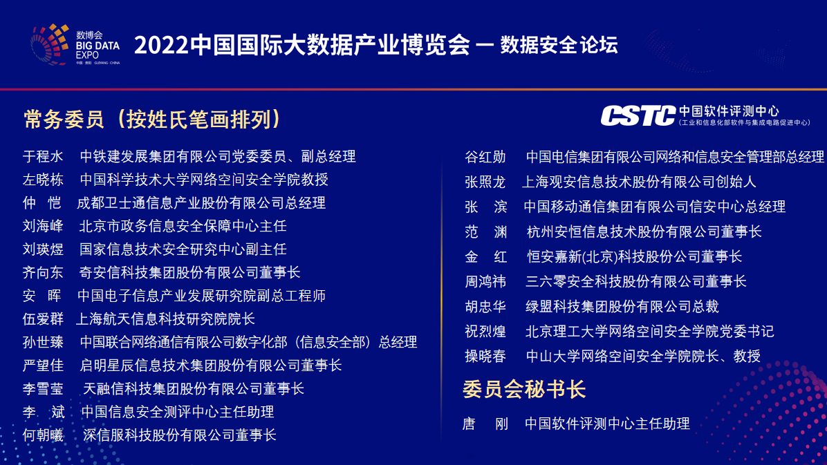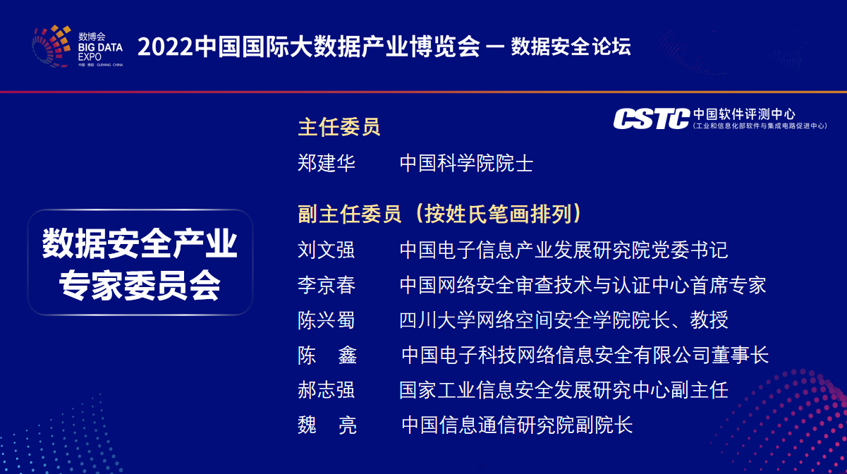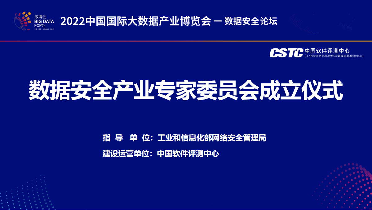 在會上,舉行了“數據安全產業專家委員會成立儀式”。數據安全產業專家委員會是在工業和信息化部網絡安全管理局的指導下,由中國軟件評測中心組織成立。專家委員會由中國科學院鄭建華院士任主任,賽迪研究院黨委書記劉文強、審查認證中心首席專家李京春、四川大學網絡空間安全學院院長陳興蜀、中國網安董事長陳鑫、電子一所副主任郝志強、中國信通院副院長魏亮等6人任副主任委員,賽迪研究院副總工程師安暉、360董事長周鴻禕、奇安信董事長齊向東、觀安創始人張照龍、安恆董事長範淵、深信服董事長何朝曦等22人任常務委員,同時吸納各行業領域專家學者80餘人為委員。委員會秘書處設立在中國軟件評測中心,主任助理唐剛擔任秘書長。