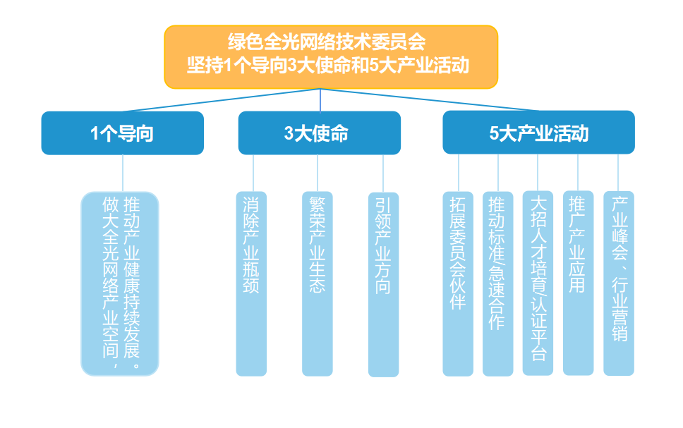 在某機構2021年發佈的《千兆光網賦能社會價值提升,光通信社會價值白皮書》顯示:2020年全球光通信產業市場已達1.4萬億元,而到2025年將達到3.2萬億元。可以預見,千兆全光網絡將持續賦能千行百業,帶動萬億市場空間。作為國內首家全光領域行業協會組織,綠色全光網絡技術委員會堅持1個導向、3大使命和5大產業活動: