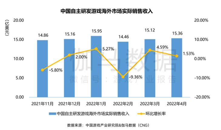 海外市場方面,受到《使命召喚手遊》、《明日方舟》、《第五人格》等產品的增長影響,中國自主研發遊戲海外市場實際銷售收入為15.36億美元,環比增長1.53%。