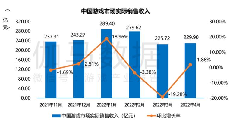 5月27日,伽馬數據發佈了《2022年4月遊戲產業報告》。報告顯示2022年4月中國遊戲市場實際銷售收入229.90億元,環比增長1.86%,同比下降3.40%。其中移動遊戲市場實際銷售收入169.59億元,環比增長2.39%,同比下降5.29%;客户端遊戲市場實際銷售收入達49.39億元,環比、同比均取得增長。