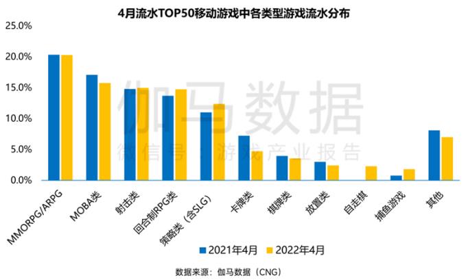 從細分品類看,移動遊戲類型持續呈多元化發展。在伽馬數據統計的移動遊戲4月流水Top50榜單中,MMORPG/ARPG品類流水份額繼續保持首位,較去年同期不變;得益於《夢幻西遊》《問道》等經典產品以及新遊《重返帝國》的穩定表現,回合制RPG類與策略類均實現流水份額的增長。