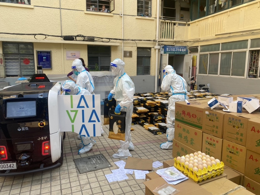 當時上海防疫形勢嚴峻,社區需求零散而紛雜,有從街道送居委的、從盒馬送社區的,也有小區內部跑腿的。達摩院協同街鎮社區、菜鳥、盒馬等力量,快速落地“防疫保供”模式,完成黃浦區、楊浦區、臨港新片區等地的社區部署,運送米麪糧油、防疫物品等。