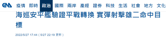 據報道,台“海軍司令部”27日傍晚發佈消息稱,“為強化海、空軍訓練,近日首次驗證‘海巡署’‘平戰轉換’納入台軍防衞作戰序列機制”,台軍已於屏東九鵬基地及台灣東部海域,實施年度導彈射擊訓練,驗證台海、空軍及台海巡艦艇實彈射擊。