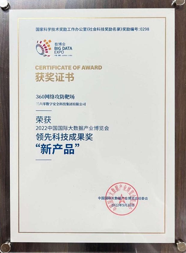 5月26日,2022中國國際大數據產業博覽會在線上舉辦。其中,“數博發佈之領先科技成果”獎正式揭曉,經過激烈角逐和層層選拔,最終共55個項目從437個申報項目中脱穎而出。憑藉為政企單位提供近似實戰的網絡安全試驗平台,以及滿足不同角色客户業務應用場景的產品優勢,360網絡攻防靶場平台榮獲2022中國國際大數據產業博覽會領先科技成果獎“新產品”獎項。